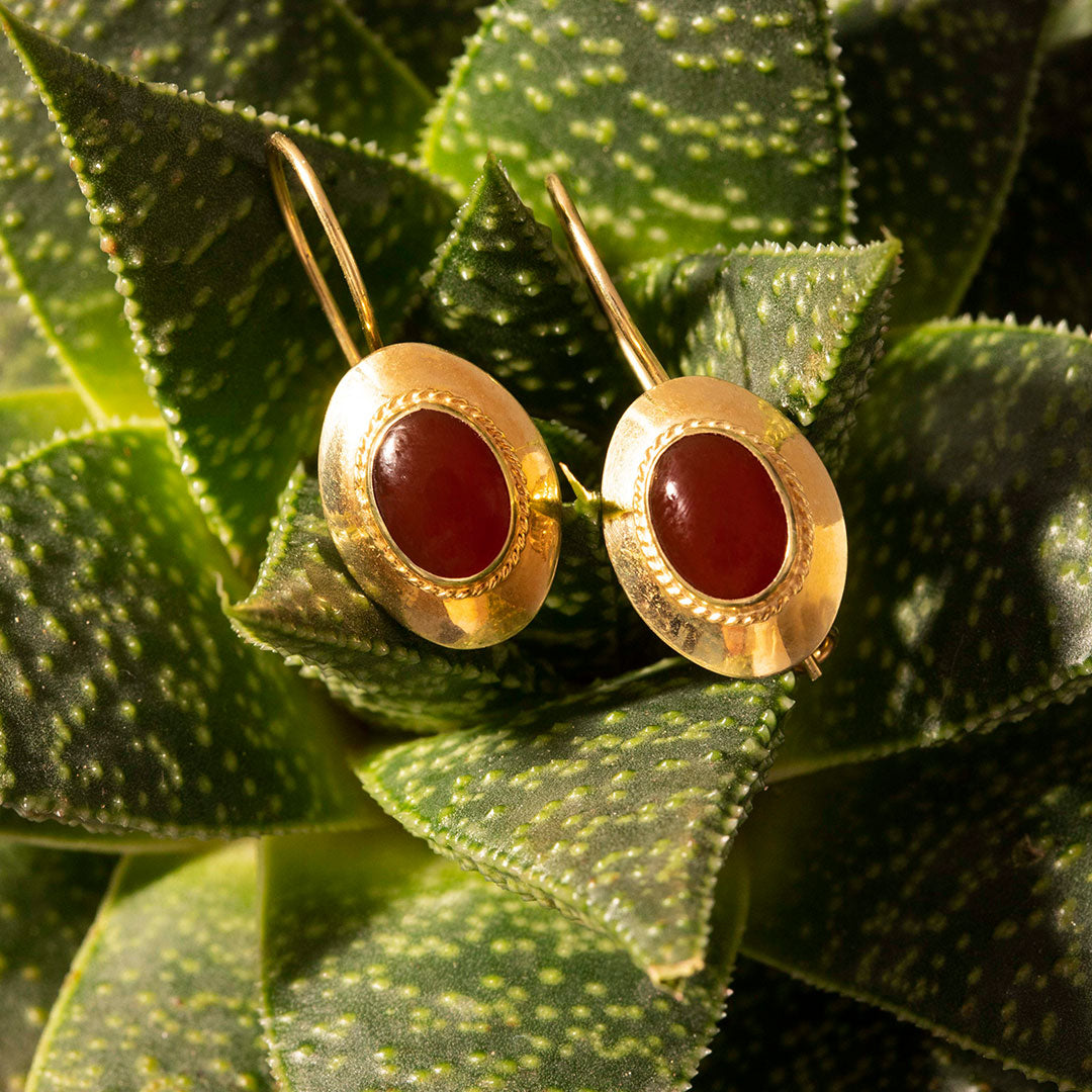 Zanaatin, üretim süreçlerindeki yoğun etkisinin devam ettiği 90larda üretilen bu orijinal vintage 14 ayar akik taşlı yeşil (sarı/gold) küpede; tam ortada konumlanan koyu tonlu akik taşın etrafı sarmal biçimde stilize edilmiş..