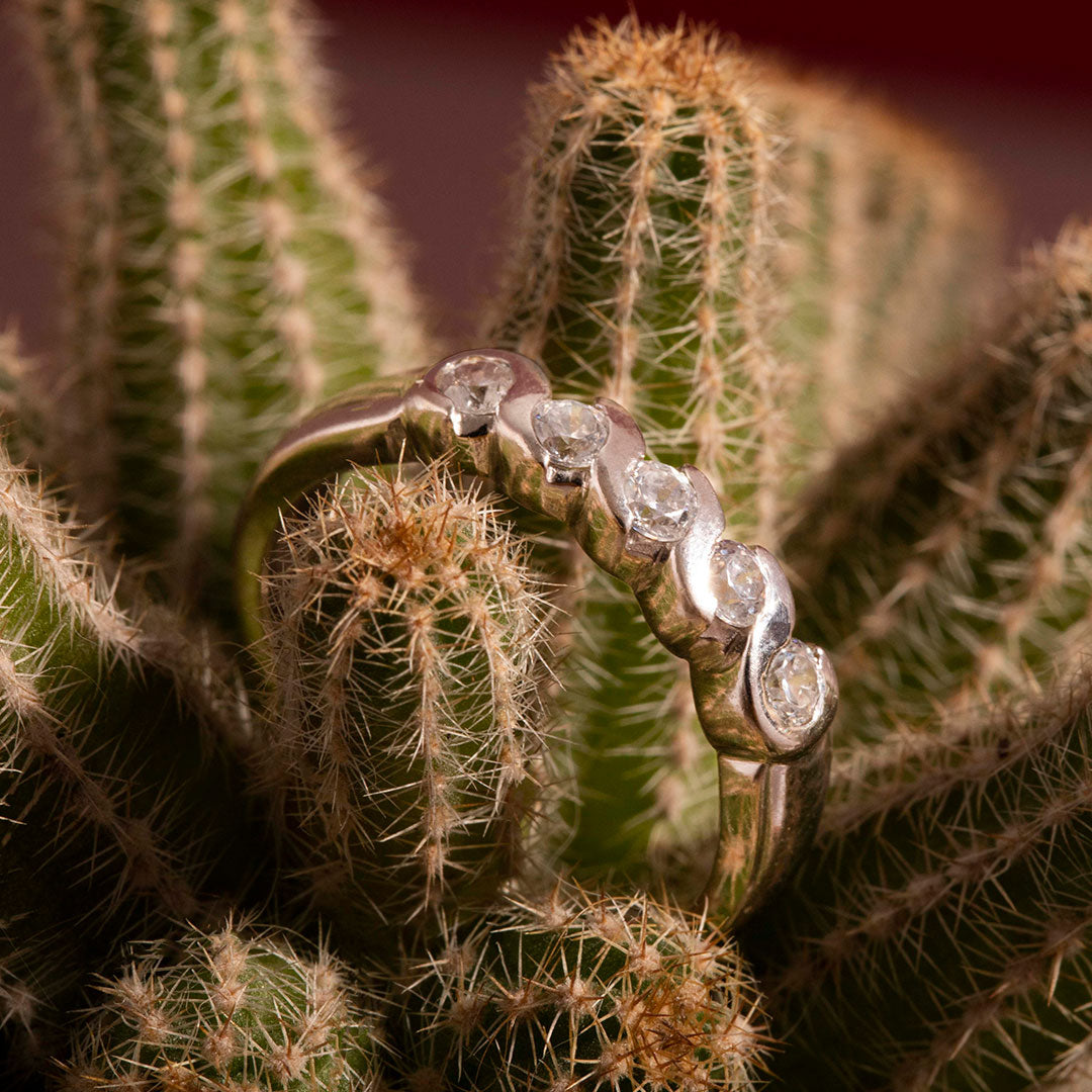 90'ların bold ayrıntılarını barındıran, 14 ayar beyaz altın, orijinal vintage yüzük. Ürün, günümüzün daha düşük ayarlı ve ince yapılı yüzük kasnak tasarımlarına kıyasla, üretildiği dönemin karakteristiği olarak kalın, tok kasnak yapısına sahiptir. Yumuşak ve döngüsel geçişler barındıran üst yapıda, alışılegelen, taşı yüksekte tutan ve köşelerinden kavrayan tırnak yapısı yerine, taşlarla birlikte adeta akıp giden bir görünümde boylu boyunca devam eden olukta gömme taşlar kullanılmıştır.