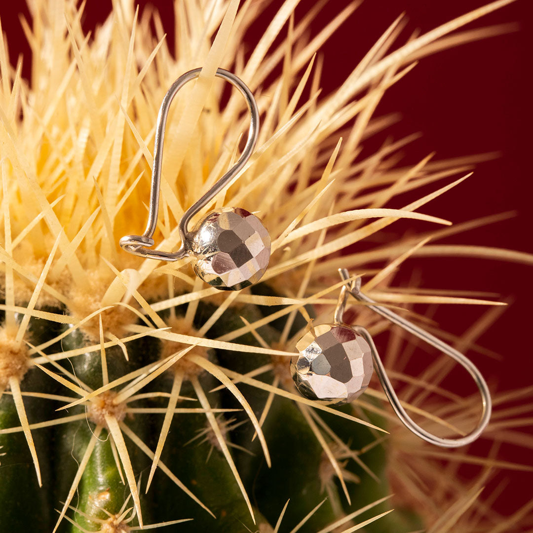 Adeta bir disko topu! 2000lerin ilk on yılında üretilen bu sallantılı top küpe, orijinal 14 ayar beyaz altından üretilmiş. Küpe her ne kadar uzaktan bakıldığında daire biçiminde gözükse de, yaklaştığınızda tüm yüzeyini kaplayan düz yansıtıcılar göze çarpıyor. Tasarımdaki bu ince ama çok etkili detay, ürünün top kısmının ışığı her yönden almasını ve yansıtmasını sağlıyor.