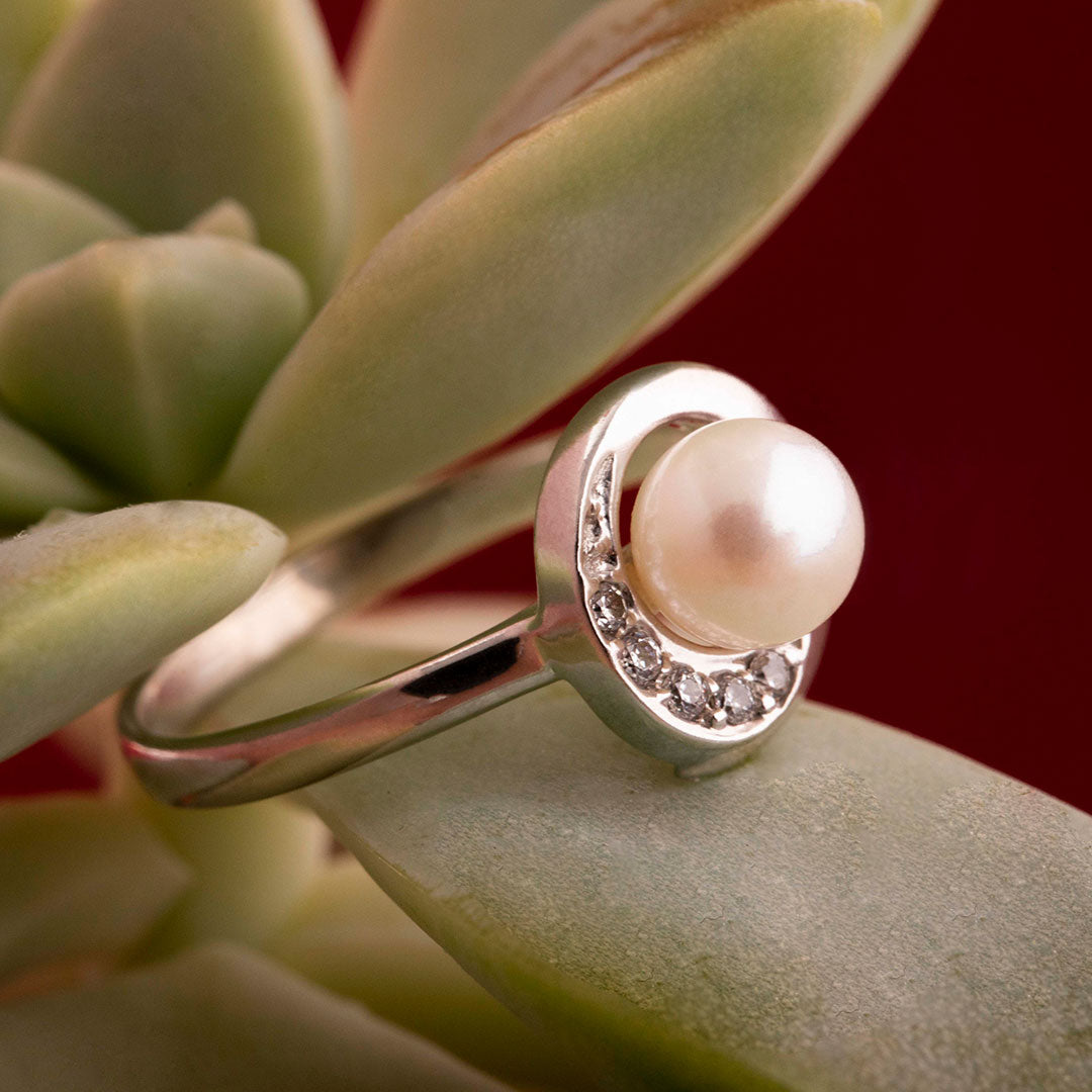 90'lardan günümüze yolculuğuna devam eden 14 ayar orijinal beyaz altın bu üründe; üst kısmın dairesel hareketi, şeffaf taşlardan beyaz kültür incisine geçişi yumuşatıyor ve odağı incide tutuyor.