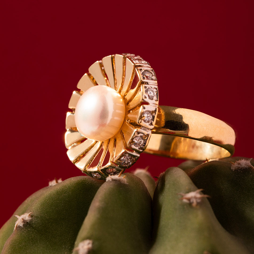2000'lerin ilk on yılında üretilen 5.41GR ağırlığındaki bu yüzükte, zarafet ve gösterişin dengesi göze çarpıyor. Merkezde konumlanan beyaz kültür incisinin taç kenarları tam tur taşla çevreleniyor.